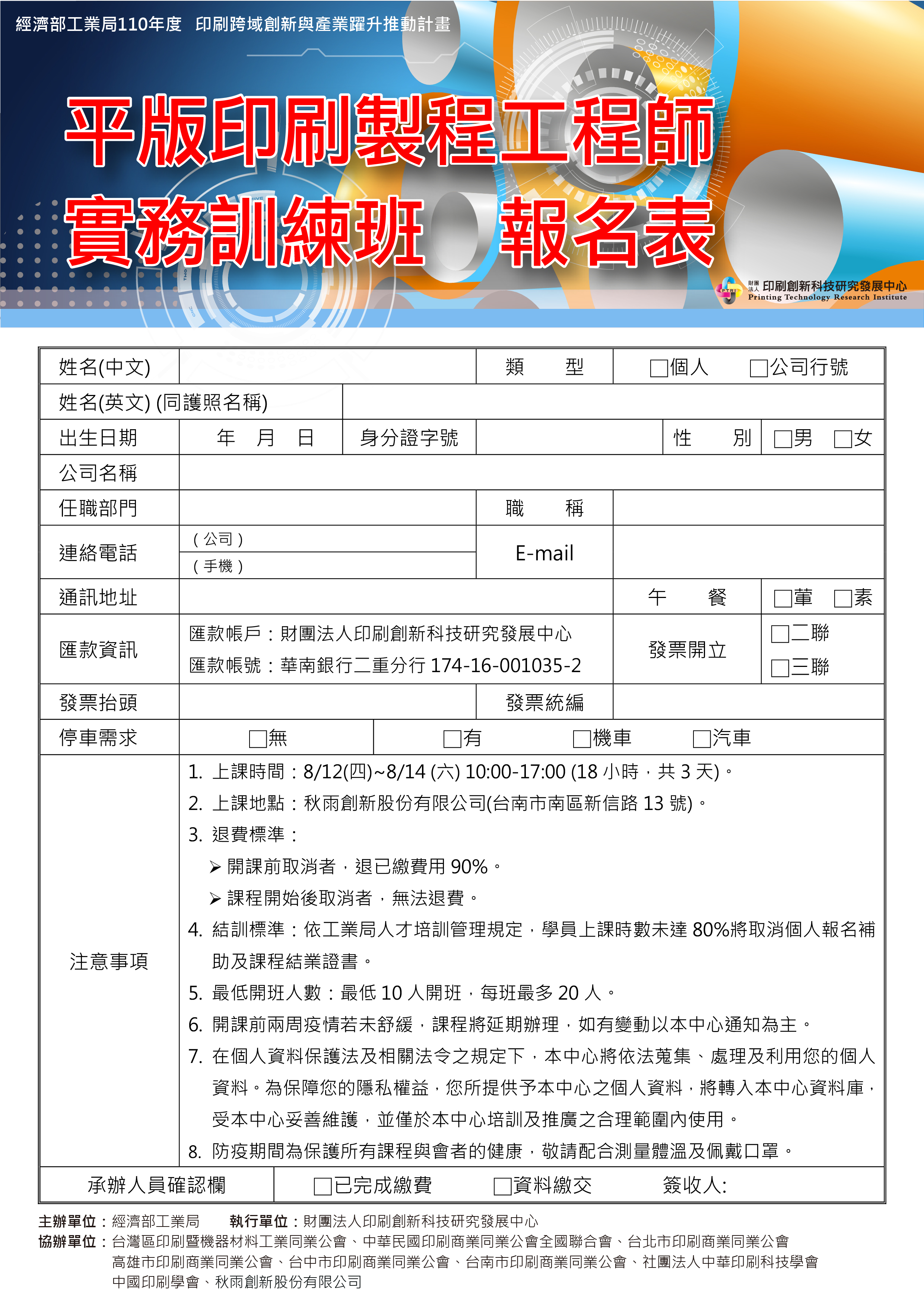 報名地點:新北市三重區光復路一段61巷27號11樓之3(印研中心)