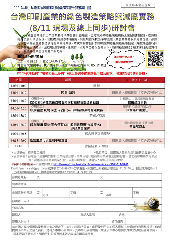 [免費研討會]111.08.11 台灣印刷產業的綠色製造策略與減廢實務(現場及線上同歩)研討會