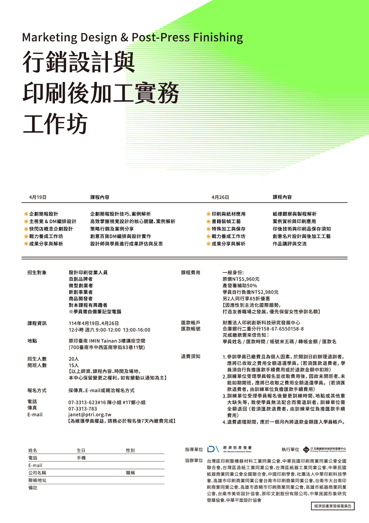 透過課程學員學習行銷設計及印刷後加工領域的專業知識與技能,能夠掌