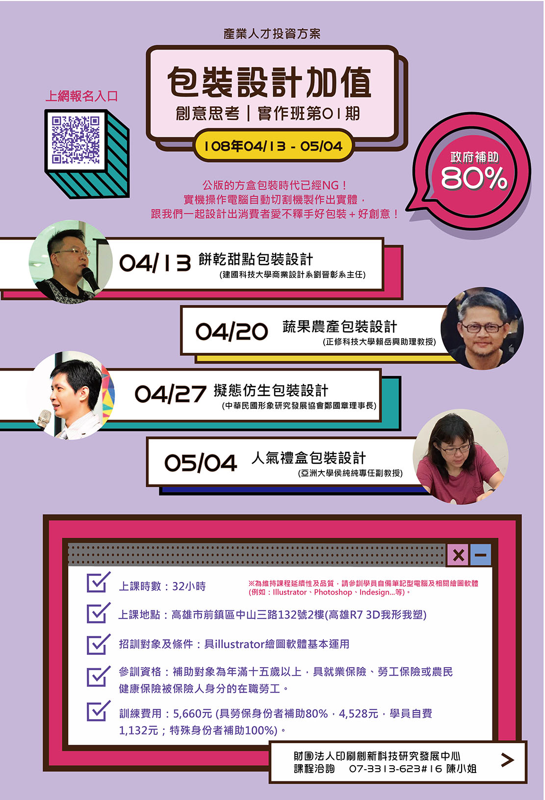 訓練成效:協助學員導入設計思維,讓包裝設計不再侷限於公版方盒,而是透過創意設計轉換成令消費者愛不釋手好包裝好創意,提升產品附加價值,進而提升產值。