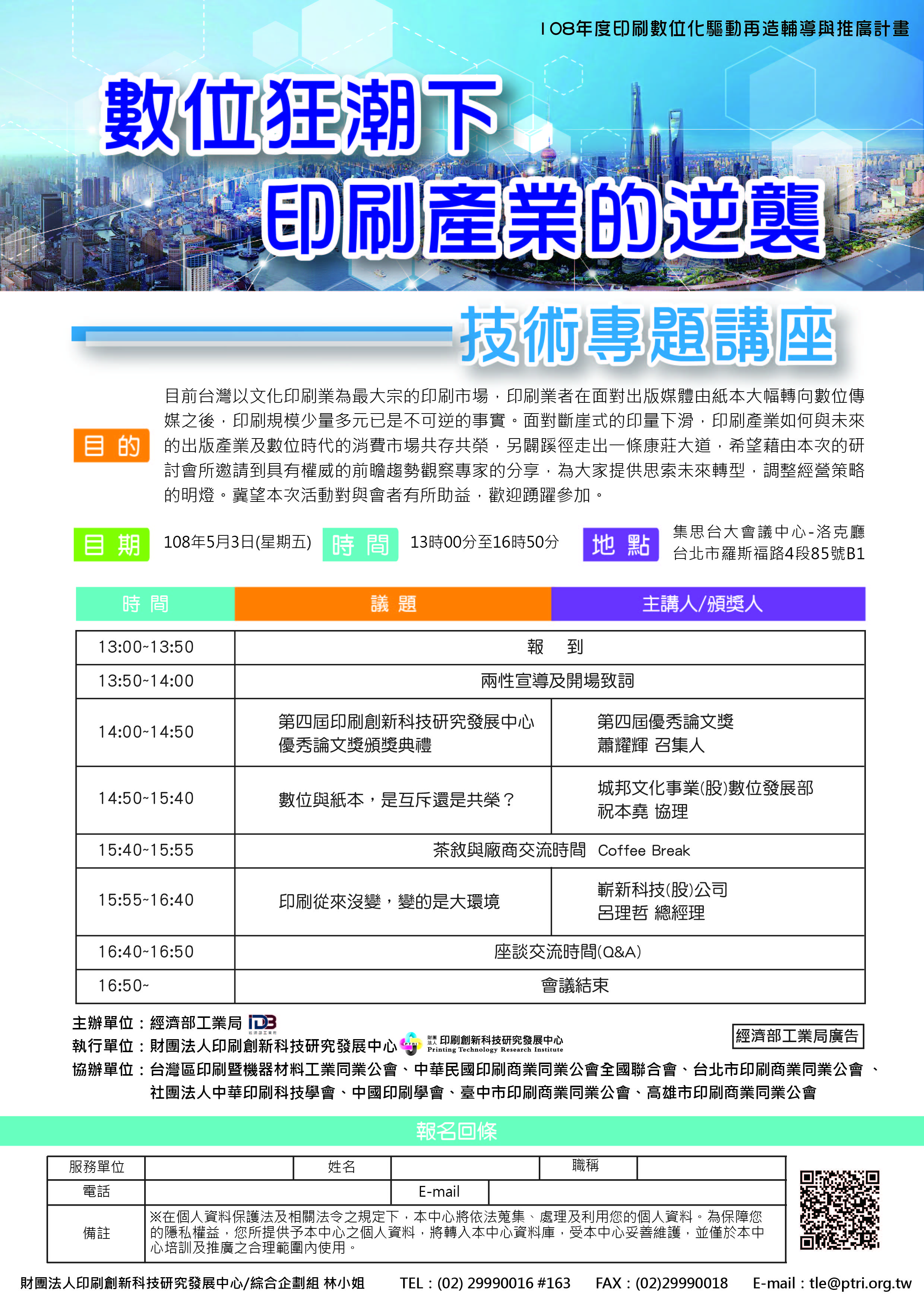 108 年度印刷數位化驅動再造輔導與推廣計畫「數位狂潮下,印刷產業的逆襲」技術專題講座